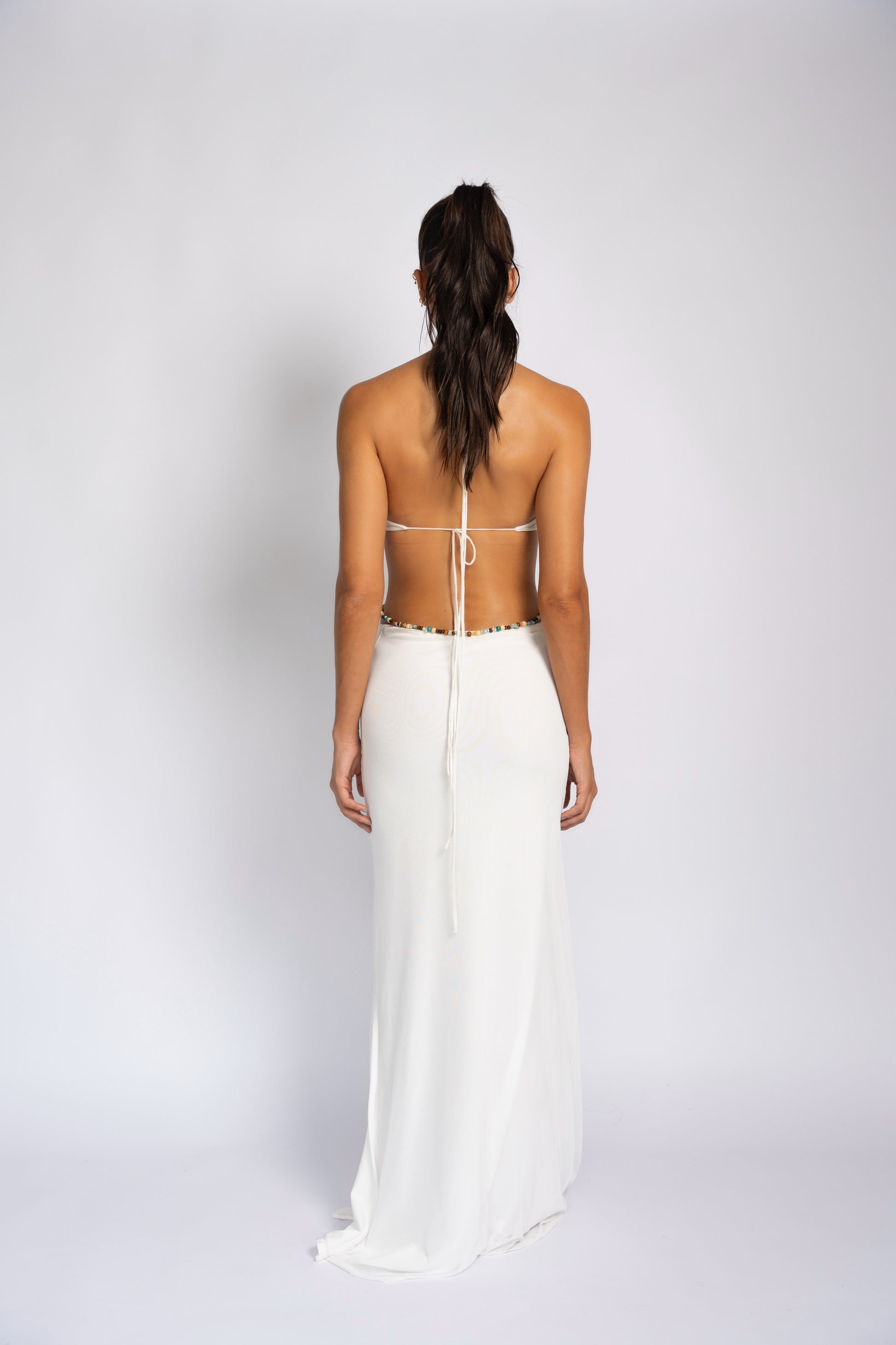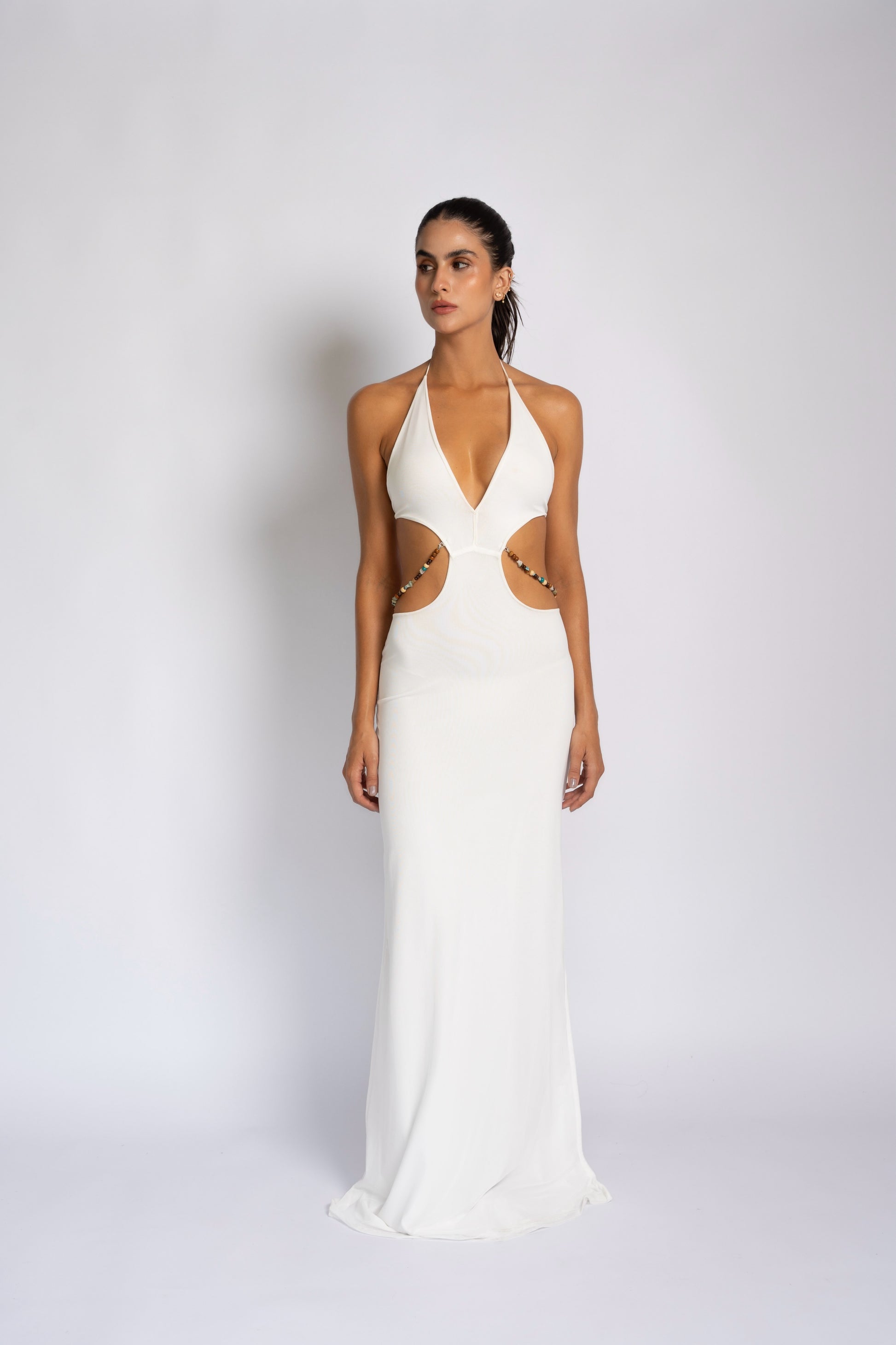 Vestido en licra y mesh con piedras removibles en la cintura.